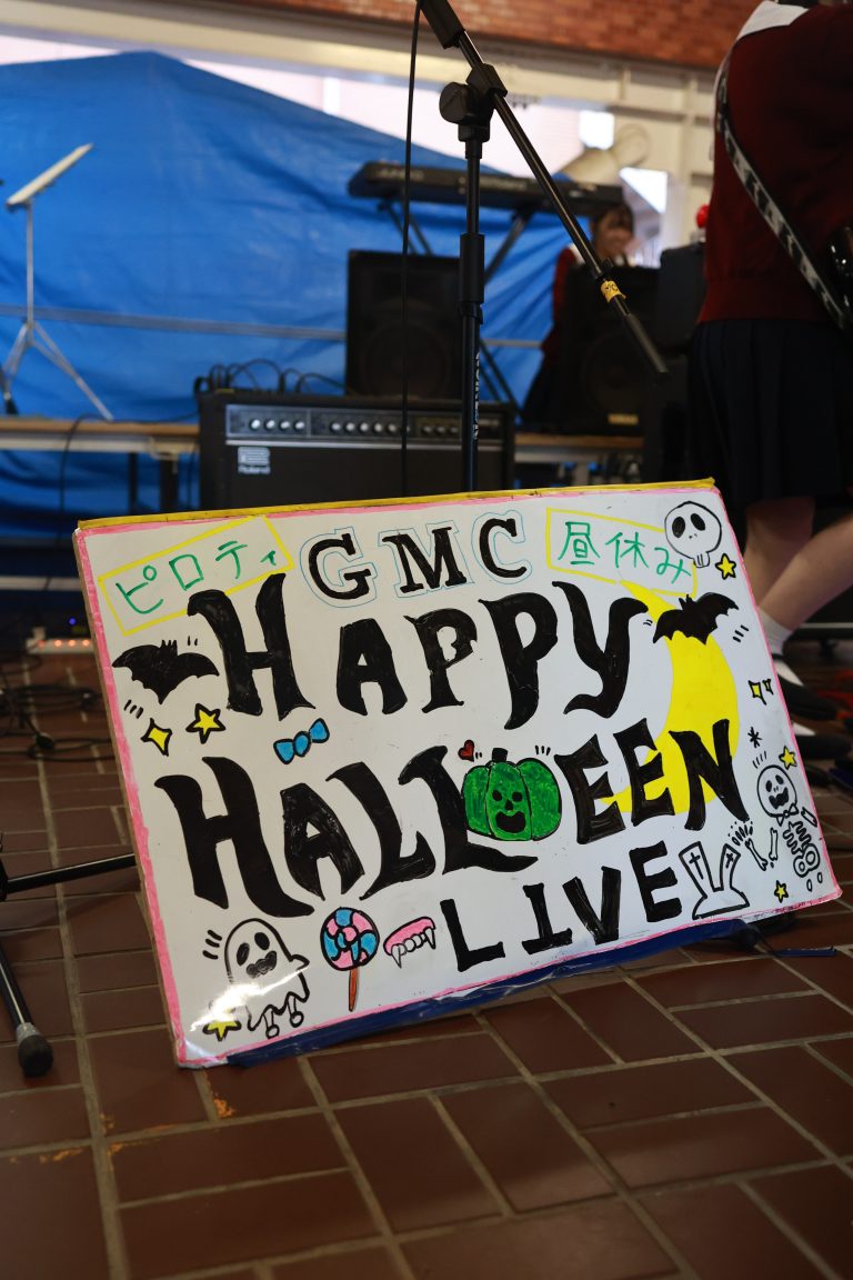 「ハロウィンライブを行いました。初めての二年生単独ライブを実施し、先輩方も応援に来てくださり心強かったです!雨の中のライブでしたがたくさんの声援があり、盛り上がりました!次回は岡山マラソンで演奏します。これからも応援お願いします!!」