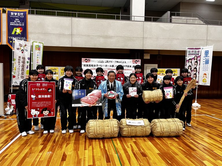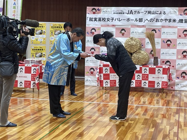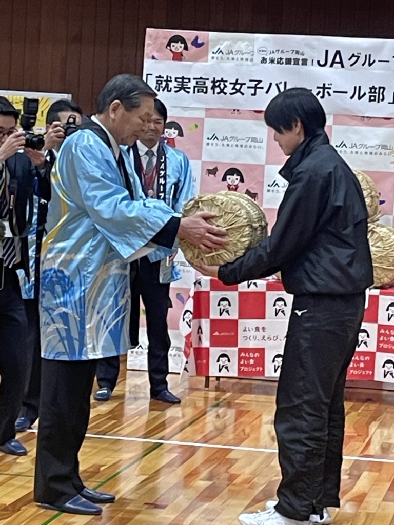 JA岡山中央会および岡山県農政協議会が主催する「岡山県産米消費拡大運動:「本気の!JAグループ岡山『お米応援宣言!』」~『おかやま米』サイコー(食べて、さあいこう)!~」におきまして、本校の高校女子バレーボール部に岡山県産米が寄贈されました。