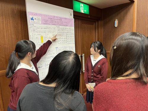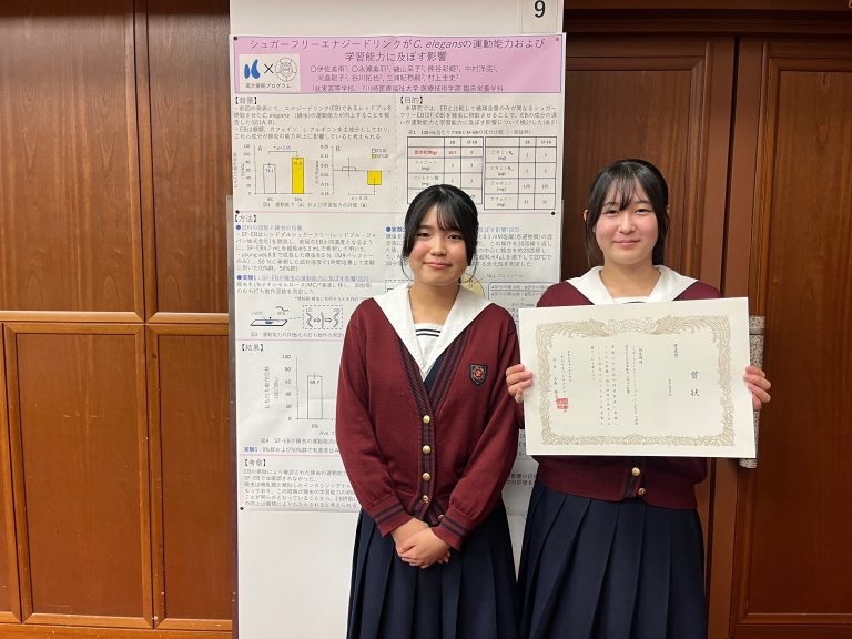 本校の高大連携プログラムの一環として、川崎医療福祉大学の先生方にご協力いただき、生徒たちは実験を通して研究に取り組んでいます。今回は、その学びの成果を発表する機会として参加させていただきました。